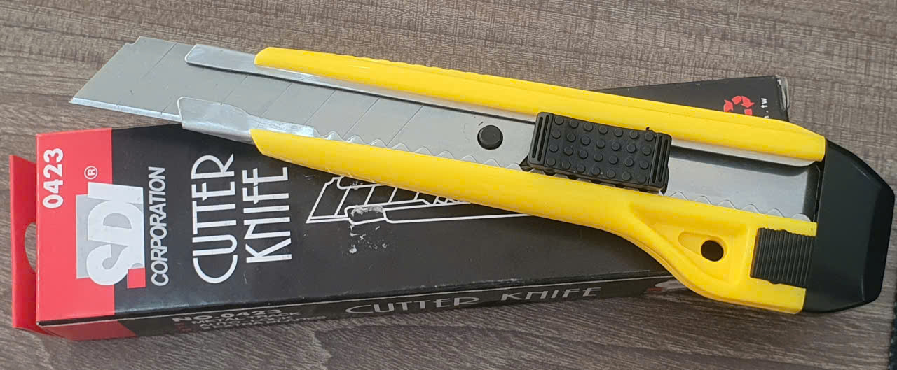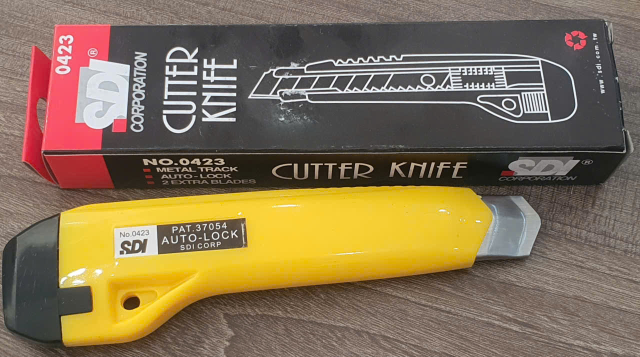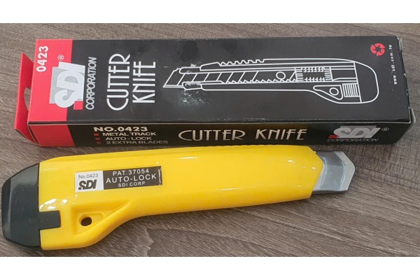 Dao SDI 0423 có lưỡi lớn 18mm làm từ thép carbon chất lượng cao (SK2+Cr hoặc SK5), phù hợp cắt các vật liệu dày như giấy, bìa, vải, nhựa, cao su. Thân dao có vỏ nhựa cứng bọc lõi thép, tay cầm chống trượt và thiết kế nhỏ gọn, giúp thao tác dễ dàng. Dao trang bị khóa tự động giữ lưỡi an toàn dưới áp lực lên đến 15kg và thường đi kèm hai lưỡi dự phòng cất trong thân dao.
