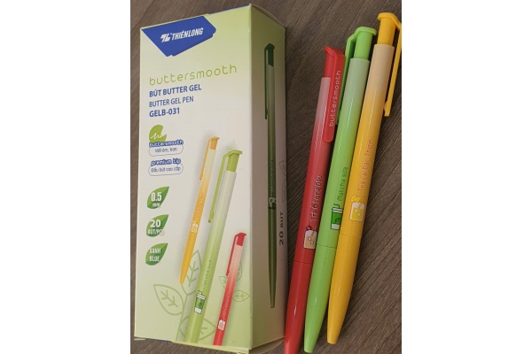 Bút gel Thiên Long GELB-031, còn được biết đến là dòng Buttersmooth Gel, là loại bút gel phổ biến với thiết kế hiện đại, đầu bi 0.5mm cho nét viết trơn tru và mượt mà.